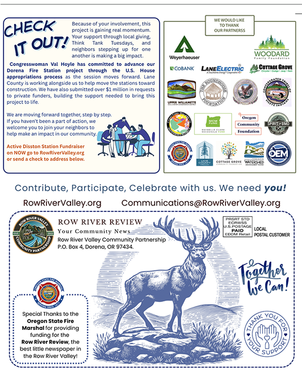 Inside, you’ll find updates on fire station progress and opportunities to get involved, along with stories that honor the people and history that shape the Row River Valley. We’re also sharing practical resources—from wildfire-safe landscaping and emergency preparedness to water safety and seasonal planning.